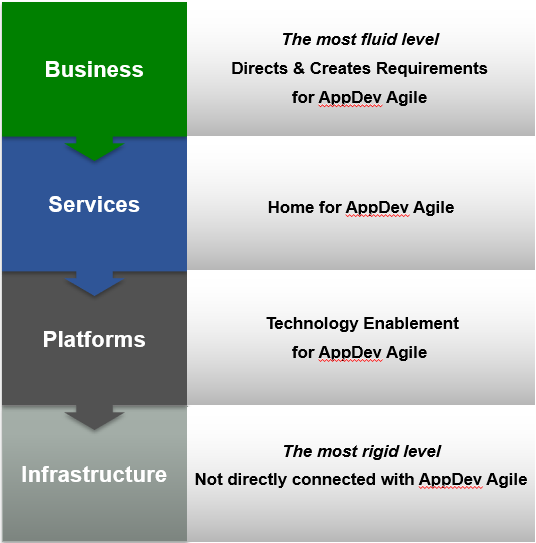 EA must understand the varying degree of agility across the levels and help create the governance and technology environment that accounts for these differences: