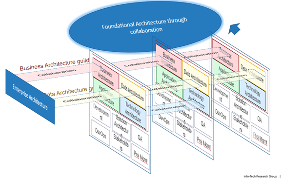 This is the idea that different domain architects will collaborate within their architecture guilds, a more formal way of sharing ideas and artifacts and approving architecture decisions. It will start with data architecture guilds, infrastructure architecture guilds, and application architecture guilds, but it will quickly expand to security, business, and integration. This can only happen if the domain architects are given the authority to make good architecture decisions in the moment on behalf of enterprise architecture.