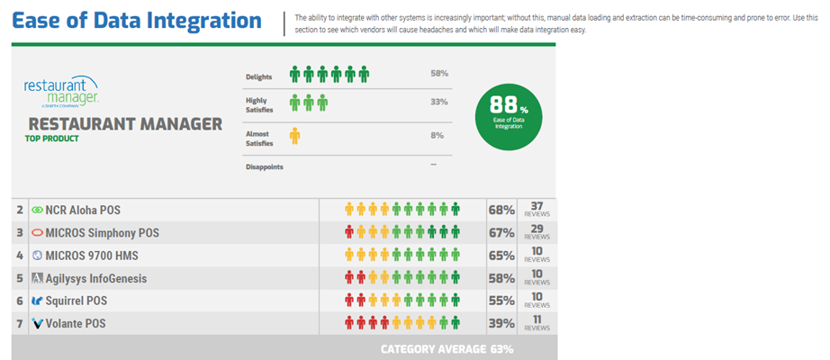 When Hospitality Technology conducted its 2019 Restaurant Technology Study, it identified which features were critical drivers of restaurant operators’ POS purchasing. Integration with other systems was identified as the most influential driver at 60%. Likewise, restaurant managers and operators were surveyed about which POS system offered the most satisfactory integration with other systems and Restaurant Manager was identified as the front runner with an 88% satisfactory rating (Food & Beverage POS Systems Data Quadrant Report).