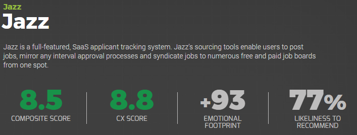 JazzHR is a comprehensive applicant tracking solution provider, covering the hiring process from initial sourcing to final offer, with reporting and analytics capabilities. JazzHR currently holds a composite score of 8.5 and an emotional footprint of +93 on SoftwareReviews (Accessed February 10, 2020).