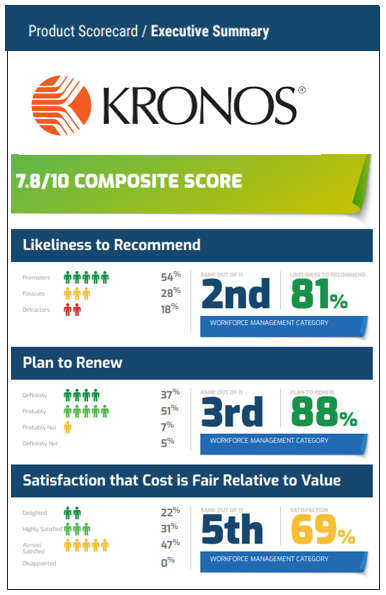 A recent survey from SoftwareReviews.com for the Kronos Workforce Management Ready and Central suites ranked Kronos Workforce Management second in likeliness to recommend and third in plan to renew (see image below). With the increased adoption of the integrated payroll functions in Kronos, the likeliness to recommend and the plan to renew values are well-positioned to increase as customers continue to drive the demand for integrated HCM solutions.