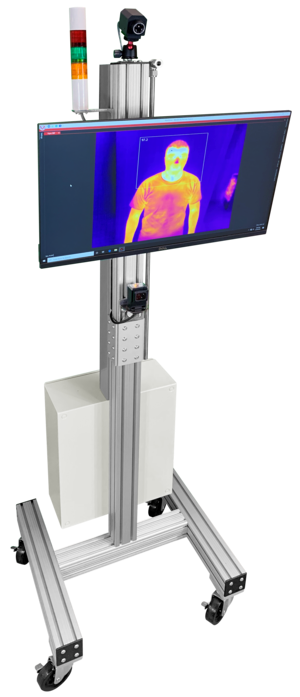 This typically consists of a camera (thermal and optical), a PC/laptop (some use tablet/mobile phone) with software and a light bar. When the thermal camera detects a body temperature above the pre-set threshold, an alarm sounds and the light bar lights up in red. This occurs in real time.