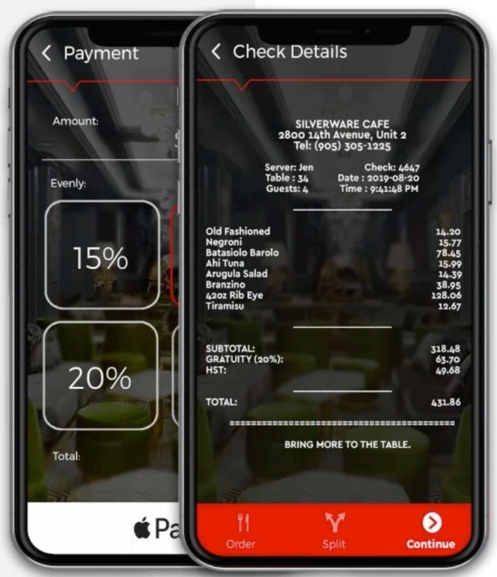 - In-Seat Guest Payments: At the conclusion of the meal, diners can add a tip and pay their bills using Apple Pay, Google Pay, and other digital form of payment such as credit card or post charges to the folio upon room number verification. Guests can view bills, split, and pay from their personal mobile devices allowing restauranteurs to turn tables faster by eliminating the guest friction of needing to find the server and pay … which also enhances the guest dining experience. Guests can pay when and how they want and leave. When paid, the server will be notified of table/amount and so on.