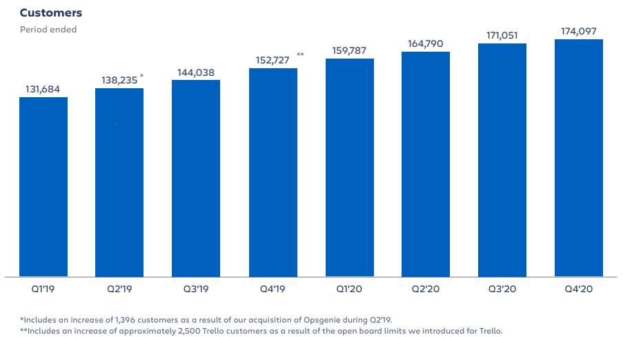 Finally, Atlassian has introduced free tier versions of its Jira Software, Jira Service Desk, Jira Core, and Confluence products for up to three (Service Desk) or ten (Software and Confluence) users. While the free tier options have substantial limitations on capacity, support, and overall functionality, it is yet another tool to attract new customers during tough economic times. Atlassian just added 3k new customers in the most recent quarter.