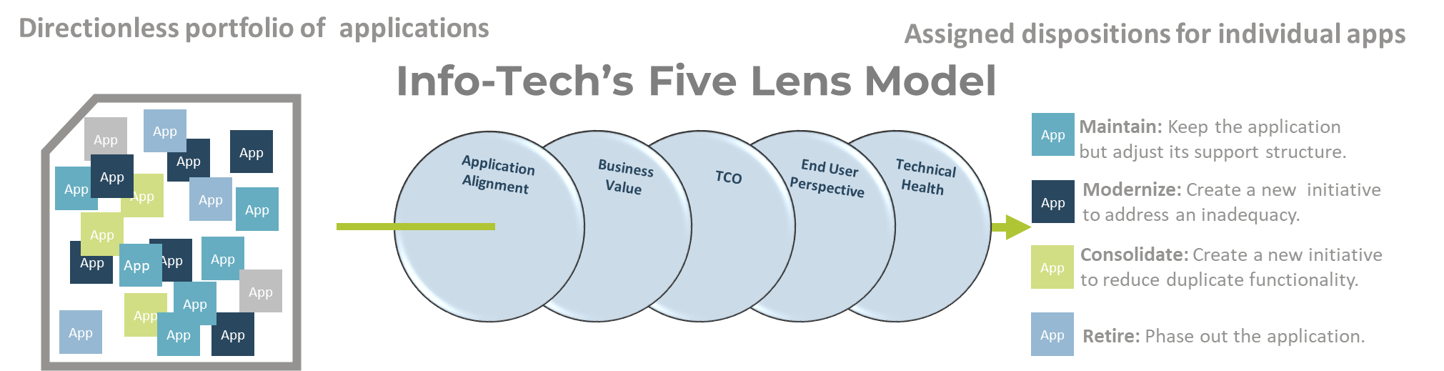 Info-Tech’s Five Lens Model for application rationalization outlines the five main criteria for evaluating your apps.